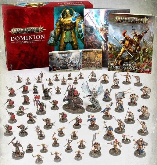 *DOMINION* With my order confirmed pre-orders for the amazing new Age of Sigmar box set are open! Not only do we have the titular box set itself but a whole host of other goodies coming on the same weekend to make your AoS experience better than ever! Firstly, the main box.... a cracking price of £112.50 for 60(!) miniatures including some great new models for both Orruks and Stormcast! We also have: Core rulebook £36 Generals Handbook £22.50 Ghurish Expanse (New sized game boards) £27 Realmscape Objective set £27 Path to Glory Diary £18 New Base paints £2.48 each -Orruk Flesh -Hobgrot Hide -Thondia Brown Stocks are limited so plese message me or the shop to let me know if you want to pre-order!